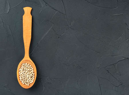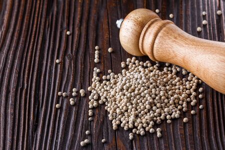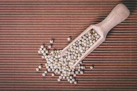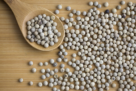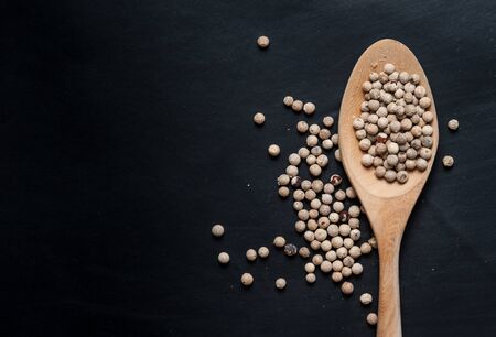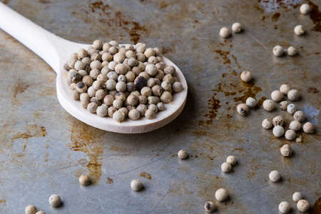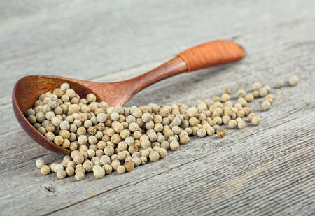 White pepper in wooden spoon on rustic wooden background. White peppercorns.
