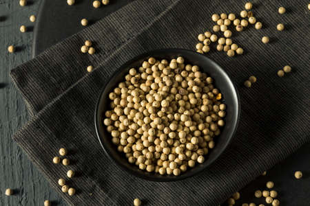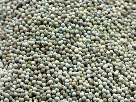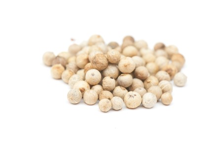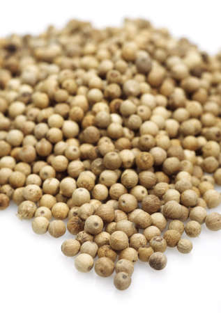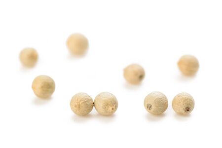 Dried white peppercorns isolated on white board with close up detail showing natural spice texture and culinary seasoning concept