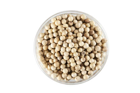 Glass bowl of white peppercorns shot from above and isolated on white.