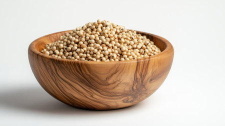 A rustic wooden bowl brimming with small, round, light brown coriander seeds, showcasing their texture and natural appearance against a clean background.