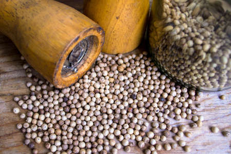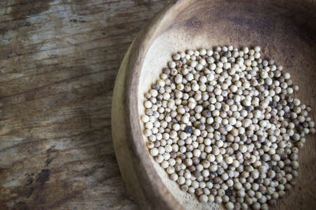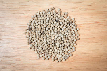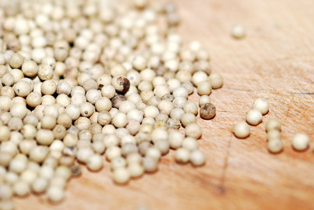 Close-up texture of white peppercorns, a pungent and aromatic spice, perfect for adding flavor to culinary dishes, on a wooden surface, ideal for cooking and gastronomy photography backgrounds