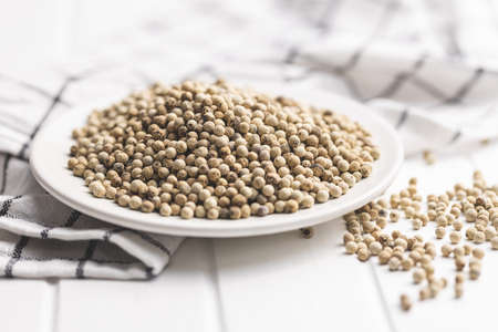 Whole pepper spice. White peppercorn grain on plate on white table.