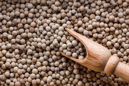 wooden spoon on pile of white pepper peppercorns (dried ripe piper nigrum fruits) closeup