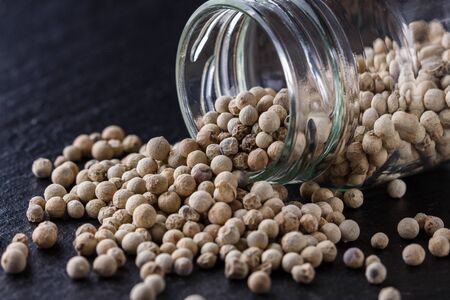 Closeup dry peppercorn seeds on black wooden board for cooking.Food ingredient photo macro