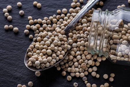 Whole pepper spice. White peppercorn grain in spoon on plate.