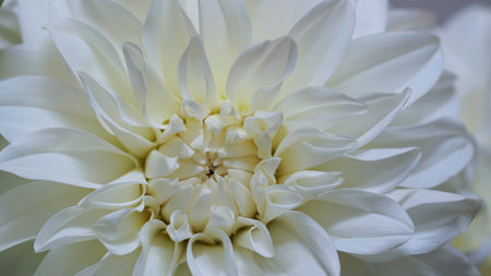 Macro photo of a white dahlia,formal decorative type, on a gray background. Beautiful flower banner, close-up, copy space. Selective focus. Petal details. Pattern, circle. Wedding celebration, bride.