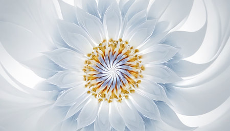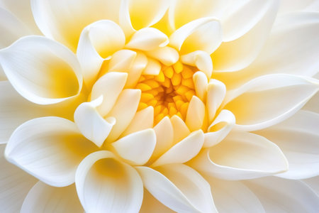 A detailed view of a pristine white petal flower featuring a luminous yellow core, set against a subtle, unobtrusive backdrop emphasizing its natural elegance.
