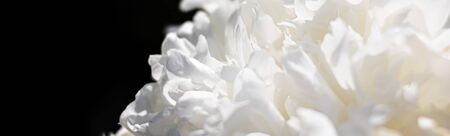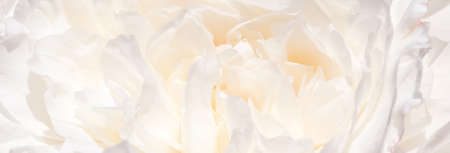 Romantic banner, delicate white peonies flowers close-up. Fragrant pink petals