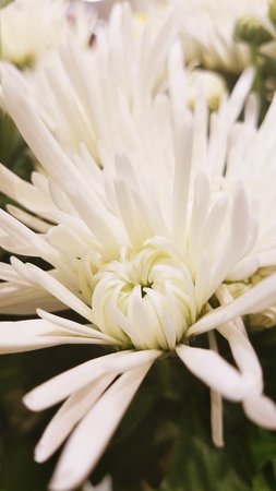 Chrysanthemum white flowers in soft pastel colors. Beautiful white flowers on a green background. Happy valentine's day or mother's day card. Mourning theme.