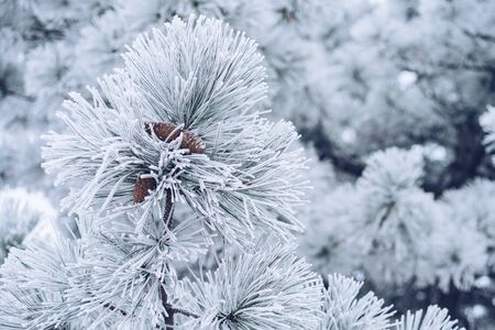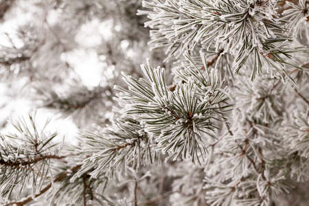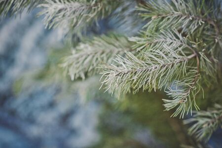 Pine branch covered with hoarfrost closeup. Winter background