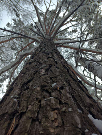 Unusual view of big old pine tree, from bottom to top, winter scene
