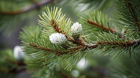 Detailed view of a pine branch showcasing frost and pine cones, set against a soft blurred backdrop, highlighting natural beauty and texture. Greeting card, copy space