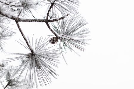 Young evergreen tree branch with a cone covered with frost, needles close-up. Pine, spruce. fir trees theme. Graphic resources, Christmas concept. Winter wonderland. Early spring. Pure nature