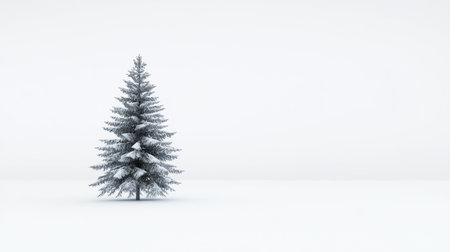 A single, vibrant green evergreen tree, perfectly shaped, stands alone in a vast, untouched expanse of white snow, symbolizing resilience and natural beauty.