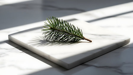 A single pine branch is placed on a white marble cutting board, which is positioned on a white marble countertop. The scene is illuminated by natural light, casting shadows on the surface.