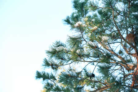 Pine branches covered with snow and frost on a light winter background. Copy space. Selective focus on a branch.