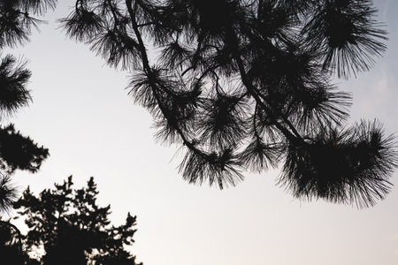 Pine tree branches create a dramatic silhouette against a soft, evening sky. Silhouetted pine tree branches reach across the sky, creating a striking contrast of light and shadow.