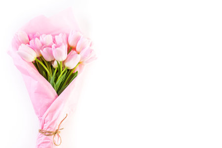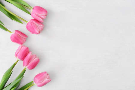 Beautiful bouquet of pink tulips on white wooden background with copy space for greeting message.
