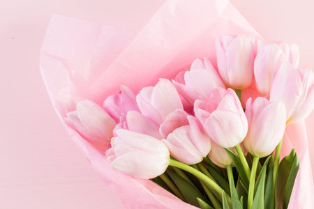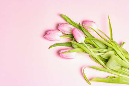 Bouquet of gentle pink tulips on pastel rosy color background. Festive gift, greeting card for Easter, Birthday, Valentines Day or Wedding. Holiday concept, a place for text