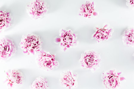 Pink and white peony flowers on a pink background. Greeting card, banner. Copy space, top view.