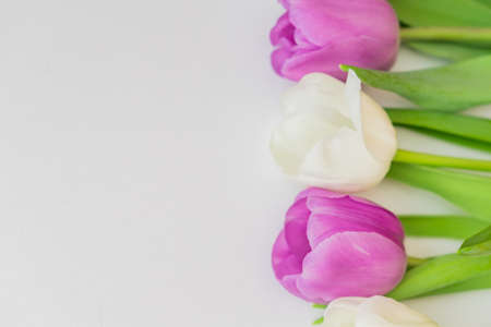 white and purple blooming tulips. floral background