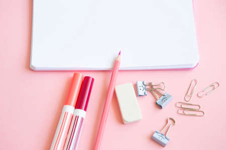 pink pencil, felt-tip pens and stationery items on notepad with blank page and on pink background