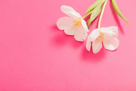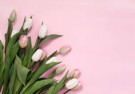 White and pink tulips on a pink background. top view