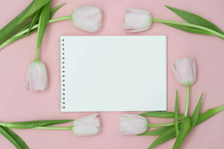Top view or flat lay of purple and white tulip flowers and blank paper card on pink background with copy space for text. Feminine concept