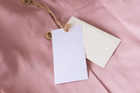 Close-up blank tag label on pink shirt. Copy space