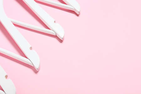 Stylish clothes hangers on color background