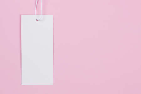 Blank white rectangular label tag on pastel pink background. Price tag tabel mock up. Top view, copy space