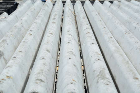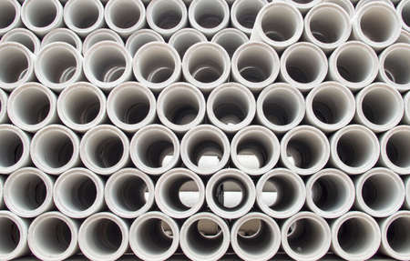 Pipes at the hardware store used for the construction. Close up concrete, cement pipes stacking, pattern background. Asbestos pipes for irrigation.