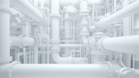 A detailed view of a complex network of industrial pipes in a clean white environment. This image showcases modern engineering design, emphasizing precise infrastructure systems.