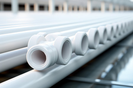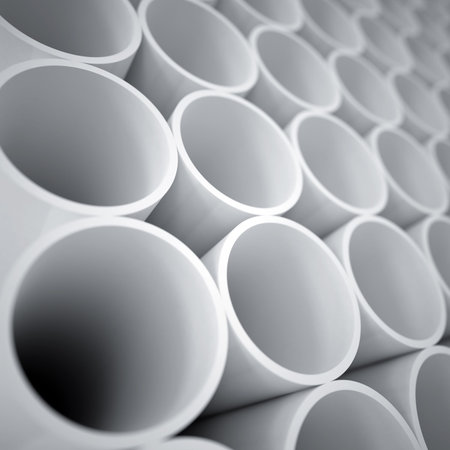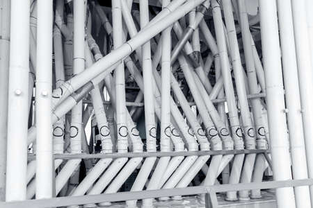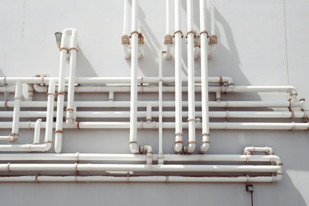 A visually striking image of white pipes arranged in a geometric pattern against a clean wall, ideal for backgrounds in industrial or construction themes.