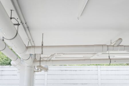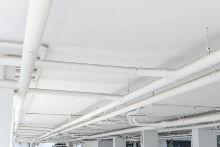 Pipes and conduits in a white rustic ceiling background. Look up view. construction background concept.