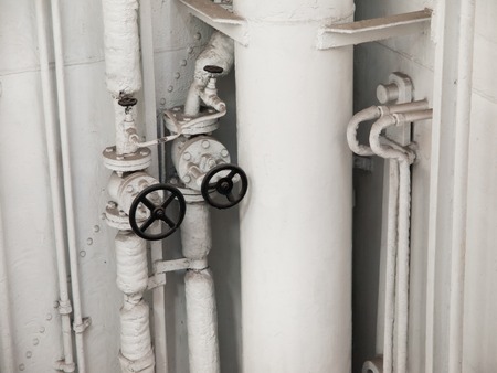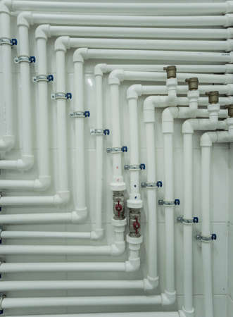 Pipeline Plumbing water system on white wall. City or home gas pipe connected to the building wall