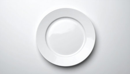 An empty white ceramic dinner plate is viewed directly from above, positioned on a clean white background with gentle studio lighting.