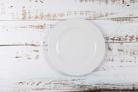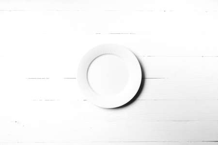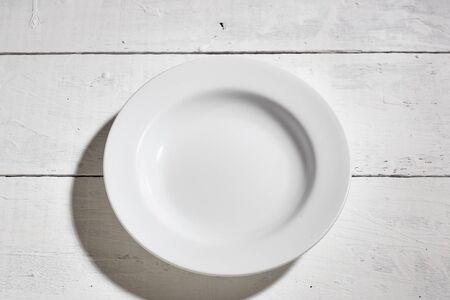 Top view of blank white dish and white on white wooden table background with copy space. for using with text and signs.