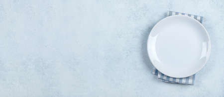 Table Setting Backround. Light plate on blue stone table with blue checked tablecloth. Place for text, copy space. Top view, flat lay. Mockup. Banner for website