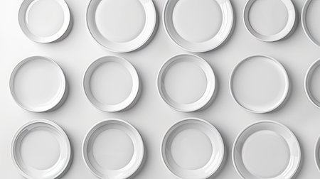 White plates template 3D rendering, dishes for presentation with realistic shadows on the background, top view. Unfolded round crockery for design.Layout of ceramic, porcelain crockery for advertising