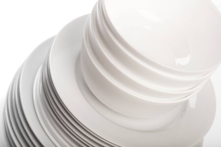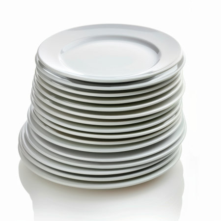 A stack of white ceramic plates on a kitchen counter, ready for a dinner party or culinary event