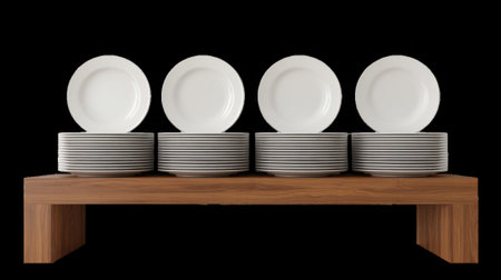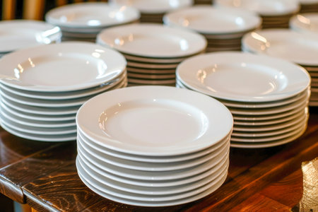 neatly arranged dinnerware ready for service, ceramic and porcelain plates organized for serving