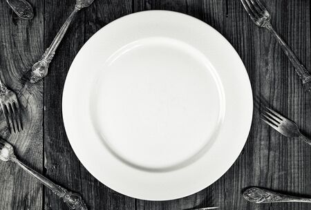 Empty white ceramic plates with spoons and forks arranged on an old black wooden table - top view.