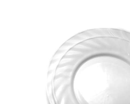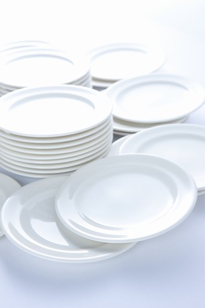 A collection of white disposable plastic plates scattered across a clean, bright background.
