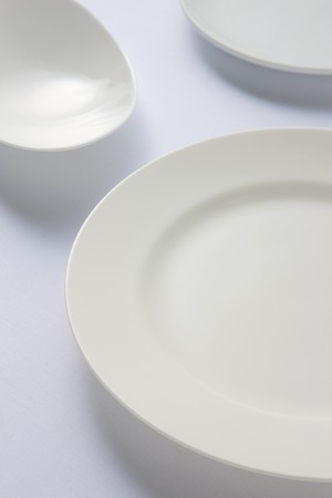 Collection of minimalist white ceramic plates on pure white background, clean and elegant