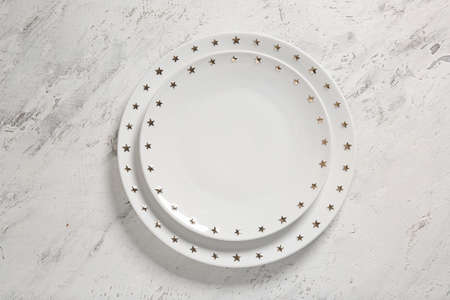 A clean white plates with gold rim are arranged on marble surface in natural light creating no dirty dishes on this national day