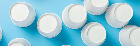 Inverted paper cups on a blue background. Banner. Flat lay, top view.