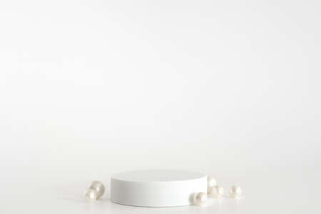 White podium with pearls on the white background, simple geometric form. Podium for product, cosmetic presentation. Creative mock up. Pedestal or platform for beauty products.