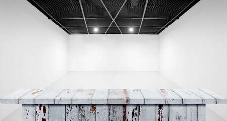 Empty white table top, counter, table, perspective room lighting background. Embed the clipping path to the wooden table.