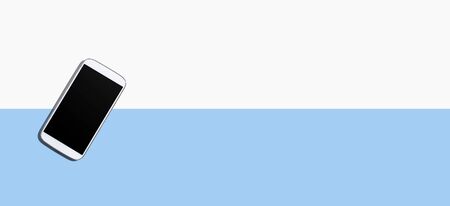 Black smartphone with a white blank screen on a blue background. Horizontal orientation, copy space